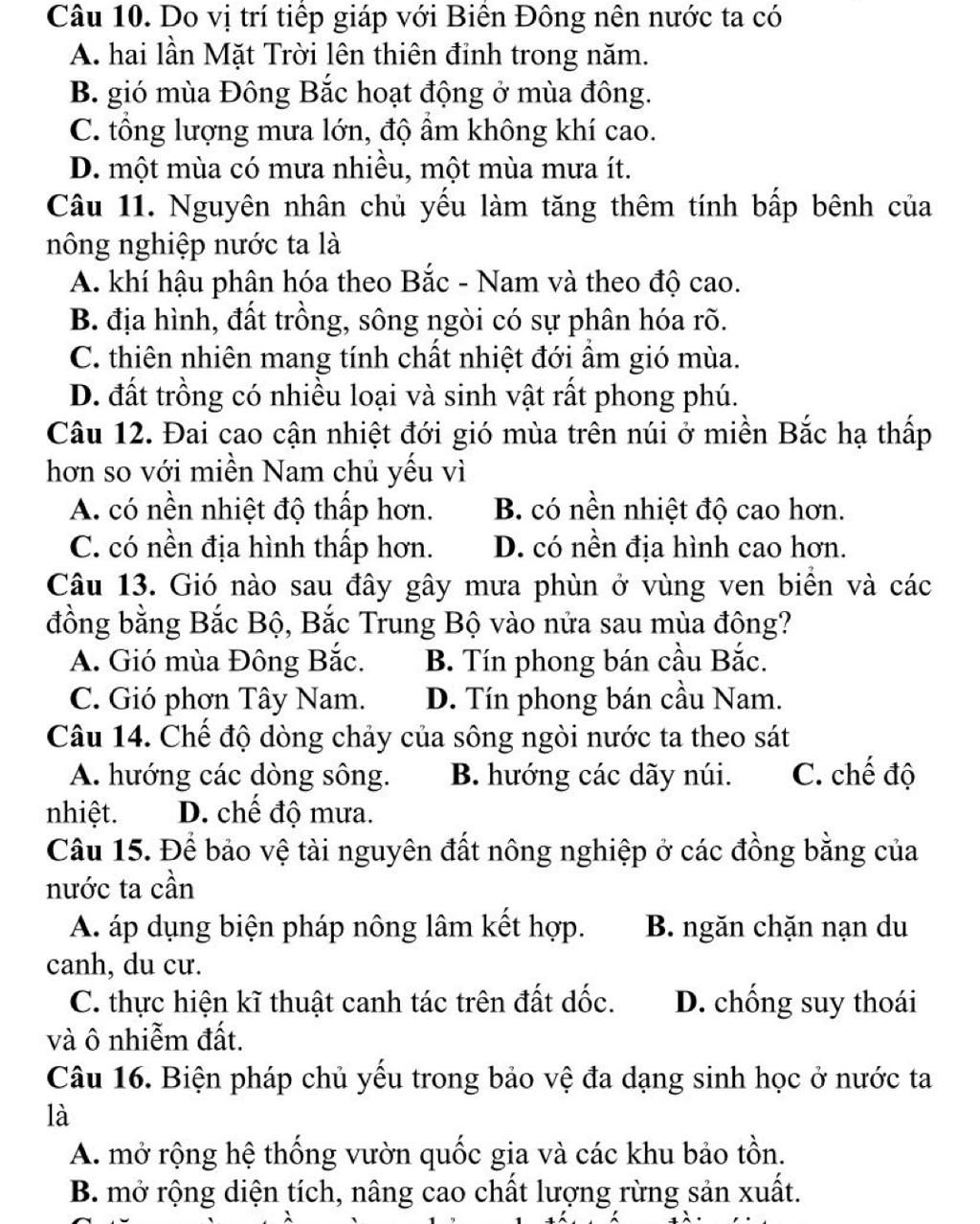 Câu 10. Do vị trí tiếp giáp với Biển Đông nên nước ta có