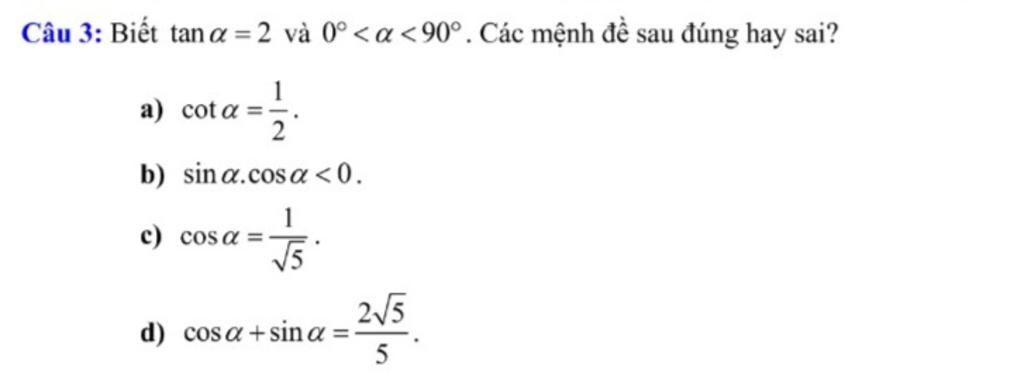`Do tanalpha = 2 > 0 => cosalpha > 0 ; cotalpha > 0 => cotalpha = 1/( tanalpha ) = 1/2`