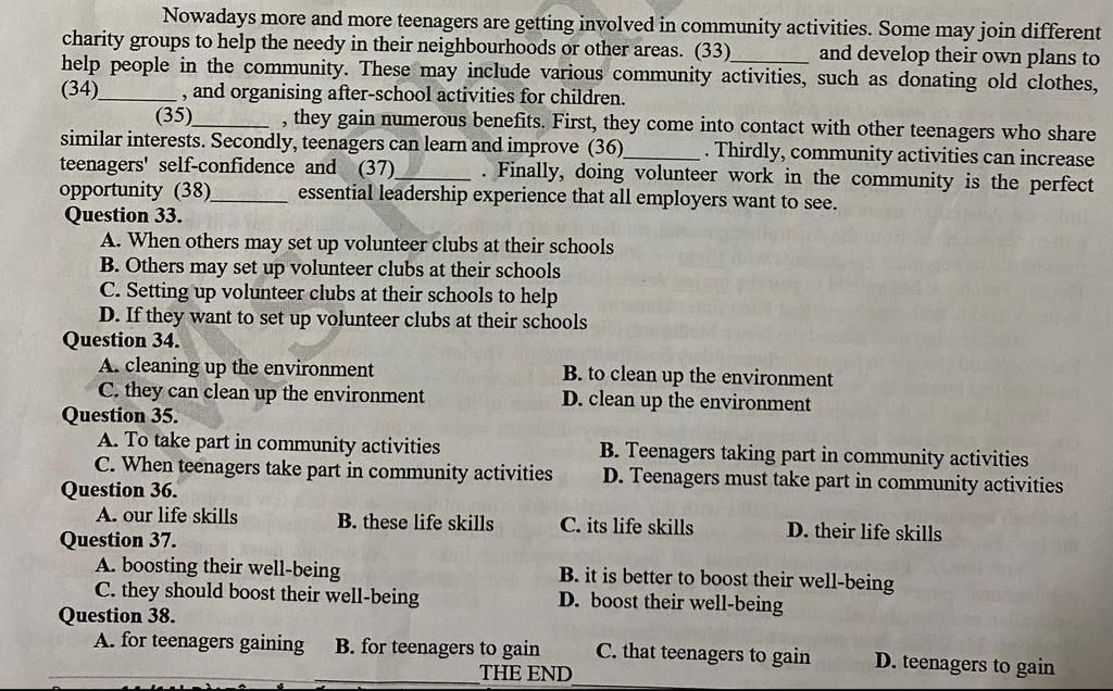 - `C` câu văn đang nói về lợi ích của hoạt động cộng đồng, dùng "should" ở đây không hợp lý.