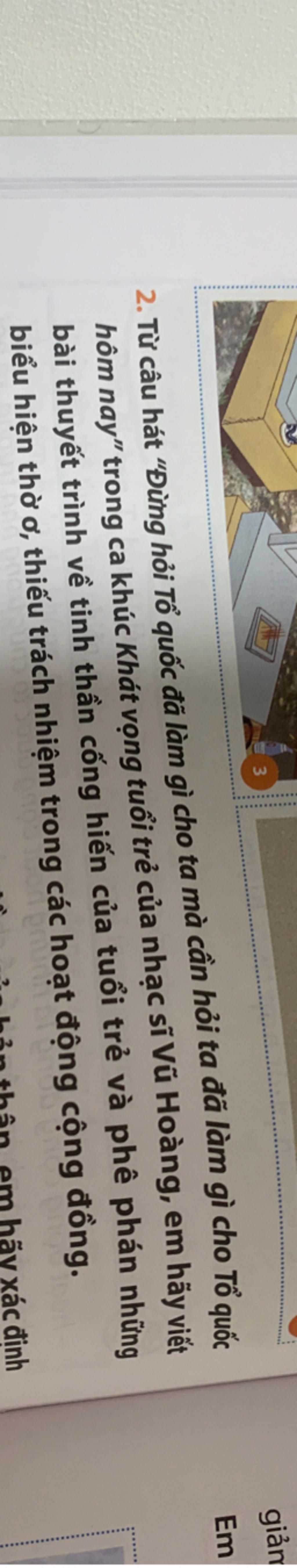 Trong câu hát ấy ,là những lời ca ngợi lên 1 cảm giác hào hùng,làm cho ta ngày càng thêm yêu nước hơn.Nhưng lại có 1 số bạn trẻ ngày nay luôn có ý nghĩ trong đầu là việc rảnh rỗi,không có ý nghĩa.Họ cho rằng nên sống vì bản thân,không quan tâm chuyện bên ngoài ra sao.Đúng,nhưng cũng có phần sai . Điều sai ấy không phải là lỗi sai nhỏ mà là 1 lỗi sai rất rất lớn.Chúng ta cần củng cố tinh thần yêu nước. Như trong câu hát "Đừng hỏi tổ quốc đã làm gì cho ta,mà hãy hỏi ta đã làm gì cho tổ quốc hôm nay".Nêu cao tinh thần yêu nước từ những việc nhỏ,rồi dần dần lớn hơn. Như Bác Hồ đã nói"tuổi nhỏ làm việc nhỏ tùy theo sức của mình".