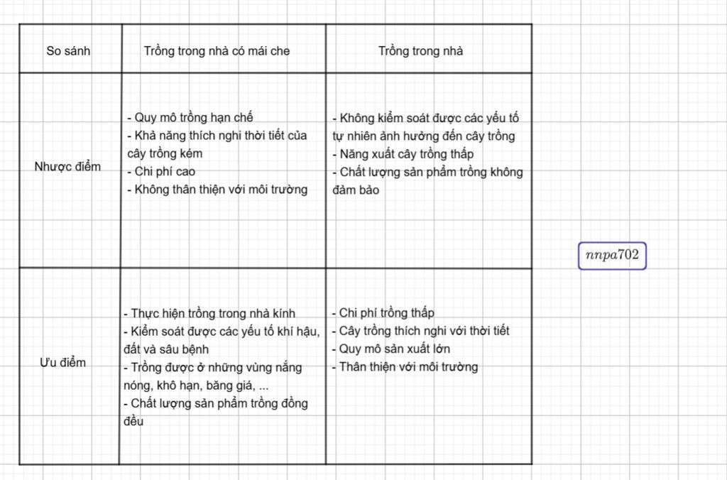 Em hãy so sánh ưu nhược điểm của phương thức trồng trọt trong nhà có mái che và trồng trọt ngoài tự nhiên