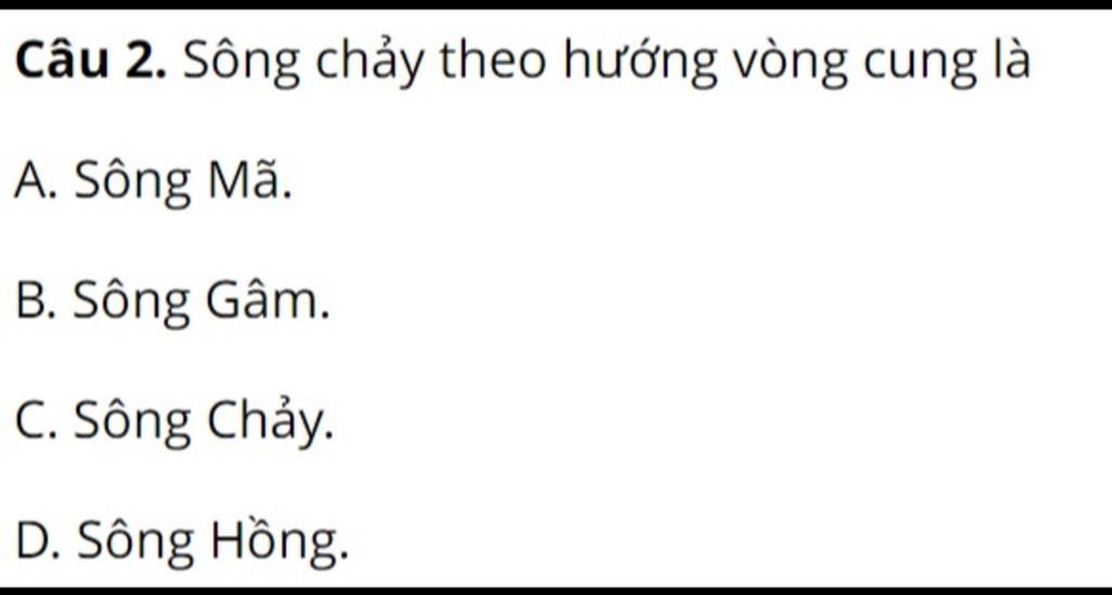 `@` Sông chảy theo hướng vòng cung là Sông Gâm. Các con sông còn lại ( sông Mã, Chảy, Hồng) chảy theo hướng Tây Bắc - Đông Nam