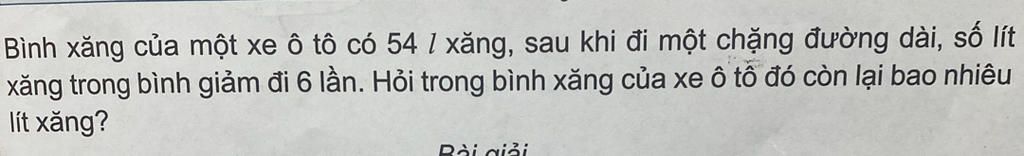` 54 xx 1/6 = 9 ( ` lít xăng ` ) `