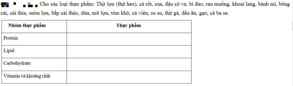 `@` Protein ( chất đạm ) : thịt lợn,sườn lợn, cua, cá ba sa, thịt gà, tôm khô