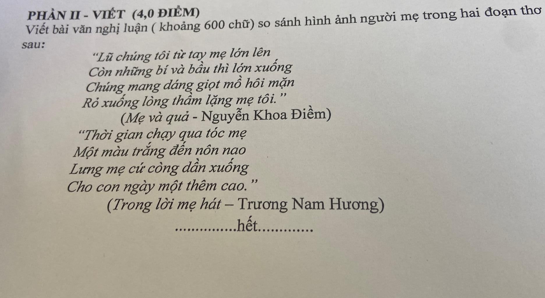 Viết bài văn nghị luận ( khoảng 600 chữ ) so sánh hình ảnh người mẹ trong hai đoạn thơ sau