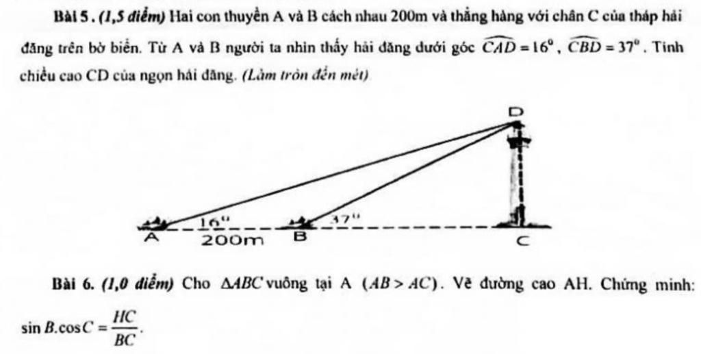 đăng trên bờ biển. Từ A và B người ta nhìn thấy hải đăng dưới góc CAD =16°, CBD = 37° . Tinh