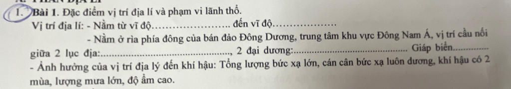 -Nằm ở rìa phía đông của bán đảo Đông Dương, trung tâm khu vực Đông Nam Á, vị trí cầu nối giữa 2 lục địa: Á và Âu, 2 đại dương: Thái Bình Dương và Ấn Độ Dương. Giáp biển Đông.