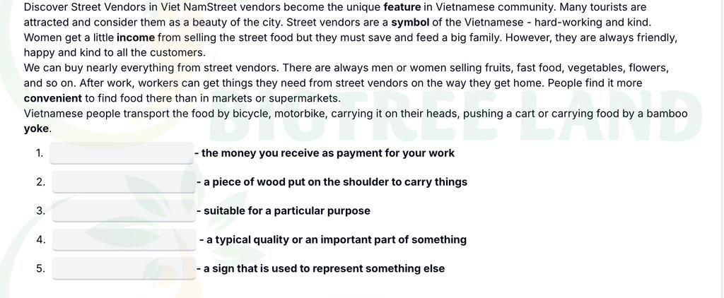 Khám phá những người bán hàng rong ở Việt Nam Những người bán hàng rong trở thành nét độc đáo trong cộng đồng người Việt. Nhiều khách du lịch bị thu hút và coi đây là vẻ đẹp của thành phố. Những người bán hàng rong là biểu tượng của người Việt Nam – chăm chỉ và tốt bụng. Phụ nữ có được một ít thu nhập từ việc bán thức ăn đường phố nhưng họ phải tiết kiệm và nuôi sống một gia đình lớn. Tuy nhiên, họ luôn thân thiện, vui vẻ và tử tế với tất cả khách hàng. Chúng ta có thể mua gần như mọi thứ từ những người bán hàng rong. Luôn có đàn ông hoặc phụ nữ bán trái cây, đồ ăn nhanh, rau, hoa, v.v. Sau giờ làm việc, người lao động có thể mua những thứ họ cần từ những người bán hàng rong trên đường về nhà. Mọi người thấy việc tìm kiếm thực phẩm ở đó thuận tiện hơn ở chợ hoặc siêu thị. Người Việt Nam vận chuyển lương thực bằng xe đạp, xe máy, đội trên đầu, đẩy xe hoặc gánh thức ăn bằng ách tre.