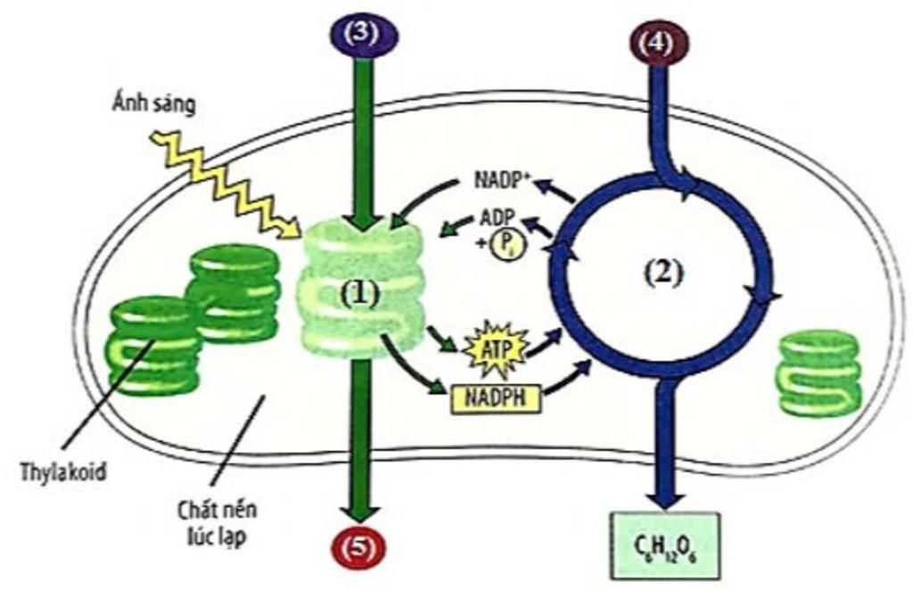 Theo mình thấy câu 2 ý 2 sai còn ý 3 đúng bởi: - Ý 2 sai ở chỗ ''Oxi hóa CO2'', pha (2) (pha tối) là khử CO2 mới đúng. - Ý 3 đúng vì phân tử (5) (Oxi) phải đi qua 4 lớp màng mới ra khỏi tế bào thực vật: Màng Thylakoid, 2 lớp màng lục lạp, màng phospholipid. Rút gọnTheo mình thấy câu 2 ý 2 sai còn ý 3 đúng bởi: - Ý 2 sai ở chỗ ''Oxi hóa CO2'', pha (2) (pha tối) là khử CO2 mới đúng. - Ý 3 đúng vì phân tử (5) (Oxi) phải đi qua 4 lớp màng mới ra khỏi tế bào thực vật: Màng Thylakoid, 2 lớp màng lục lạp, màng phosphol... xem thêm