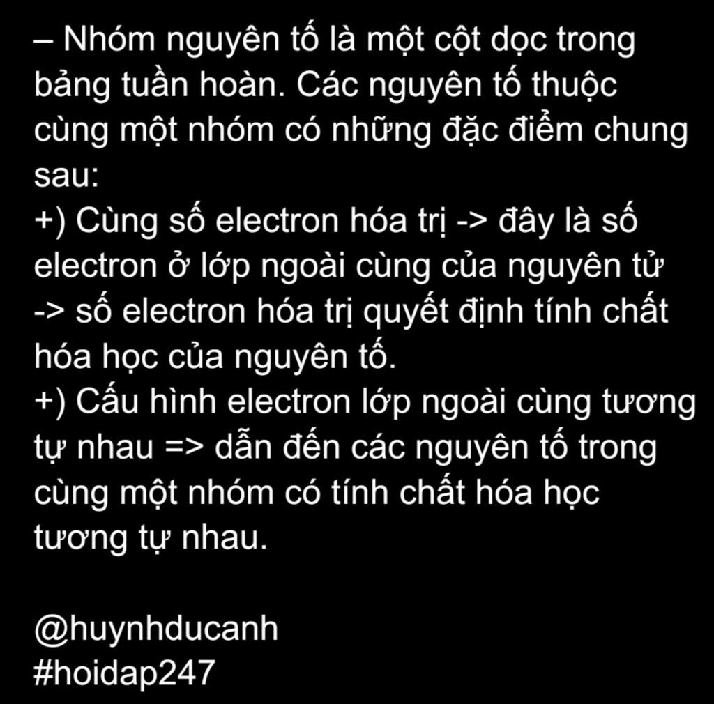 `-` Vì nhóm nguyên tố trong bảng tuần hoàn là tập hợp các nguyên tố có cùng số electron ở lớp ngoài cùng (lớp vỏ electron ngoài cùng), từ đó chúng có những tính chất hóa học tương tự nhau.