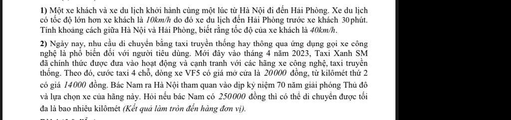 1) Một xe khách và xe du lịch khởi hành cùng một lúc từ Hà Nội đi đến Hải Phòng. Xe du lịch