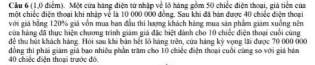 Vậy để đạt được lợi nhuận kỳ vọng `70000000` đồng, cửa hàng cần giảm giá `25%` cho `10` chiếc điện thoại cuối cùng so với giá bán `40` chiếc điện thoại đầu tiên.