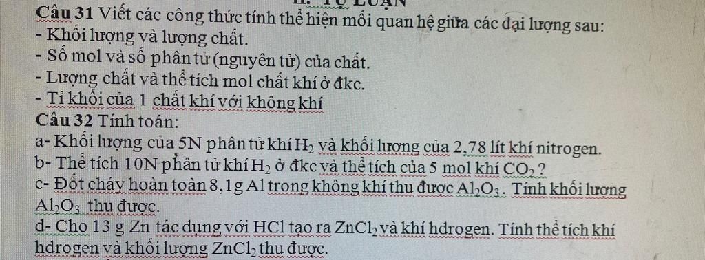 d. Cho 13g Zn tác dụng với HCl tạo ra ZnCl2 và khí hydrogen. Tính thể tích khí hydrogen và khối lượng ZnCl2 thu được: