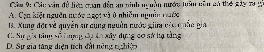`->` Đúng vì hiện nay, có nhiều quốc gia có sông, suối, ao, hồ,... đi qua nhiều lãnh thổ nên diễn ra tình trạng xung đột về quyền sử dụng nguồn nước giữa các quốc gia và có thể châm ngòi cho các cuộc chiến tranh