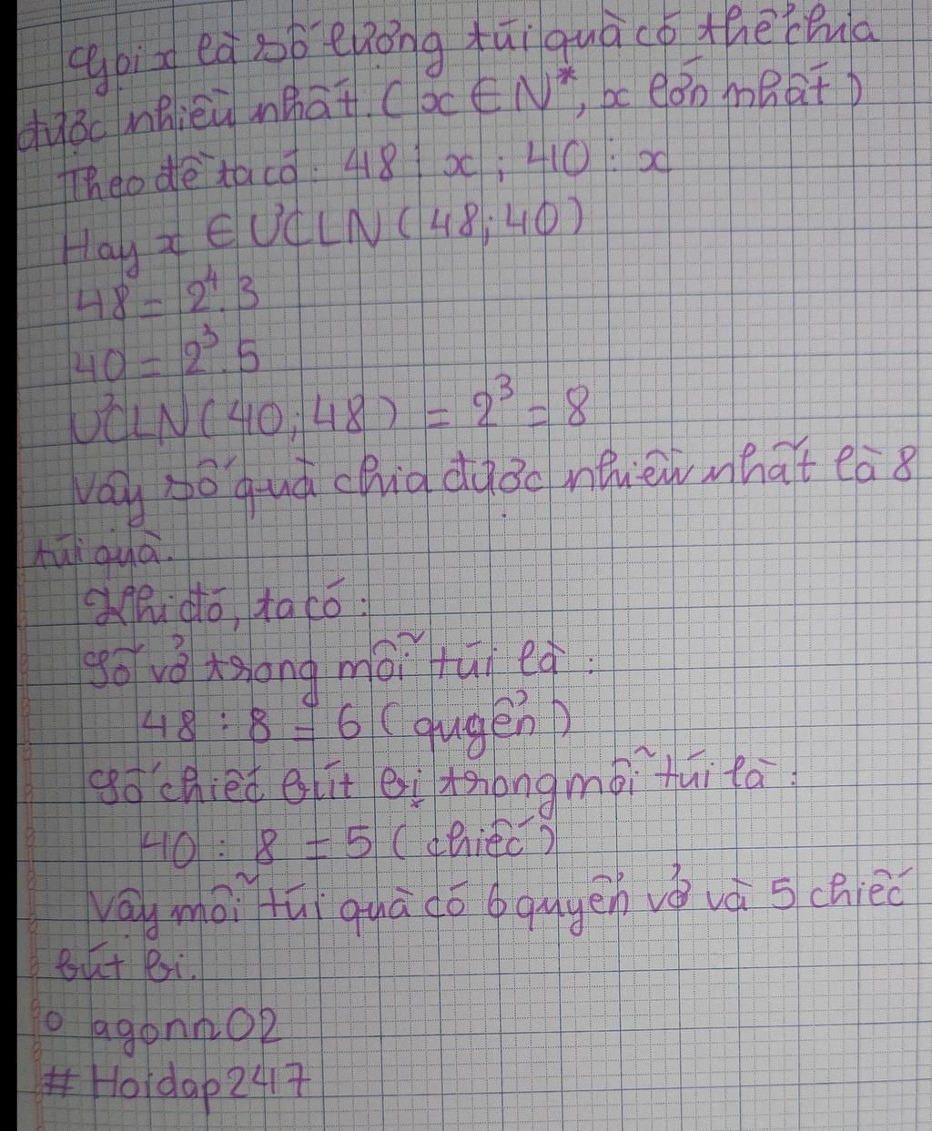 nhau. Tính số lượng túi quà nhiều nhất mà nhóm các bạn có thể chia được. Khi đó, số lượng vở,