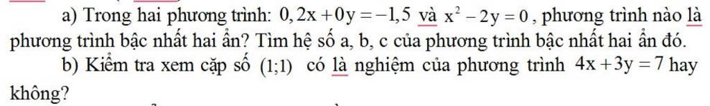 Phương trình `0.2x+0y=-1.5` có là pt bậc nhất 2 ẩn vì nó có dạng `ax+by=c` với `a,b` không đồng thời bằng 0