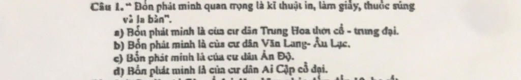 `Câu 1:` Bốn phát minh quan trọng là kĩ thuật in, làm giấy, thuốc súng và la bàn
