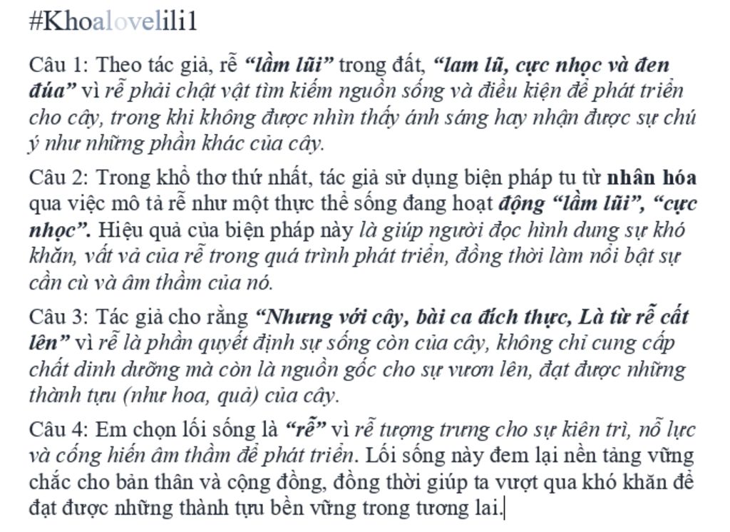 Câu 1 : Theo tác giả , vì sao rễ “ lầm lũi “ trong đất , rễ “lam luc , cực nhọc và đen đúa “ ?