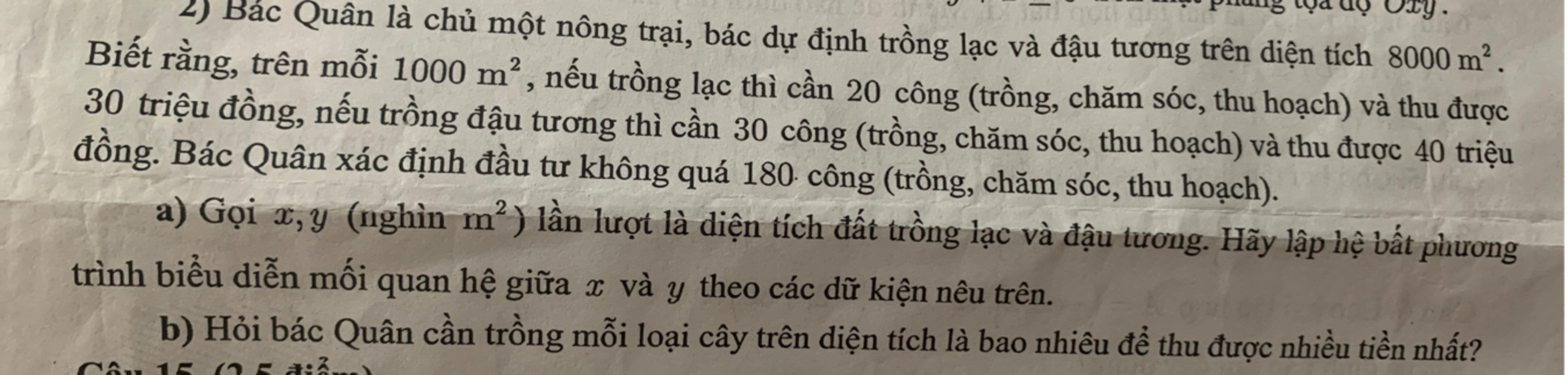 2) Bác Quân là chủ một nông trại, bác dự định trồng lạc và đậu tương trên diện tích 8000 m
