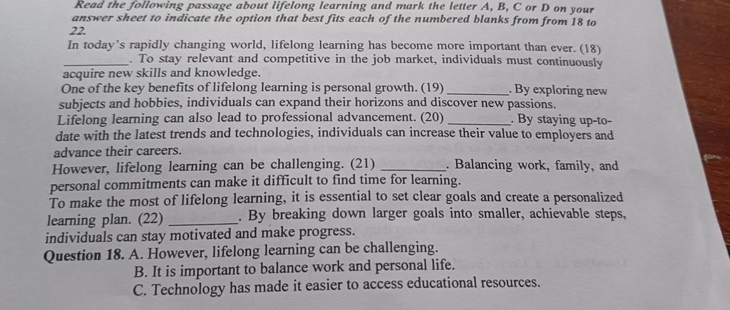 Question 18: D. Lifelong learning is essential for personal and professional growth.