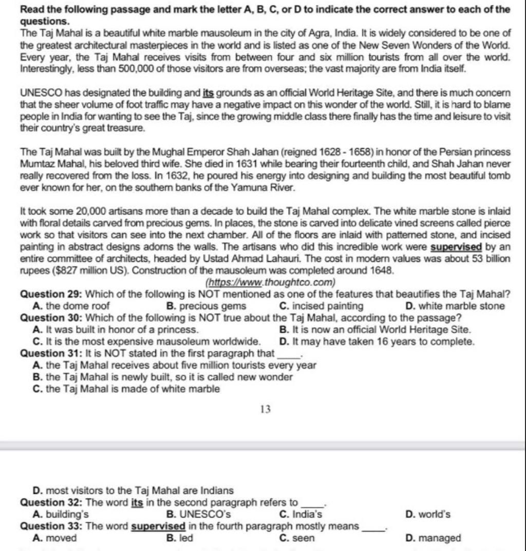 `->` Không nhắc đến "the Taj Mahal is newly built" mà chỉ có "one of the New Seven Wonders of the World"