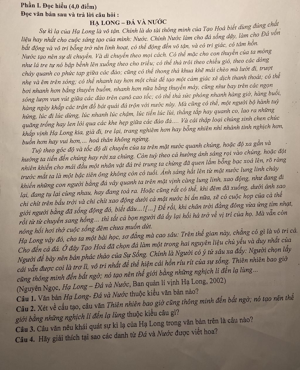 `@` "Hạ Long- Đá và Nước" thuộc kiểu văn bản thuyết minh, tác giả cung cấp thông tin cho người đọc, độc giả về Hạ Long, về những nét độc đáo mà thiên nhiên, đất trời ban tặng cho nó.
