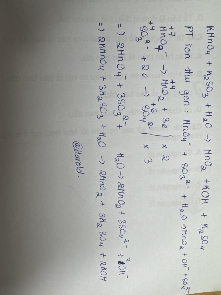 cân bằng phương trình KMnO4 + K2SO3 + H2O = MnO2 + KOH + K2SO4 theo phương pháp ion - electron