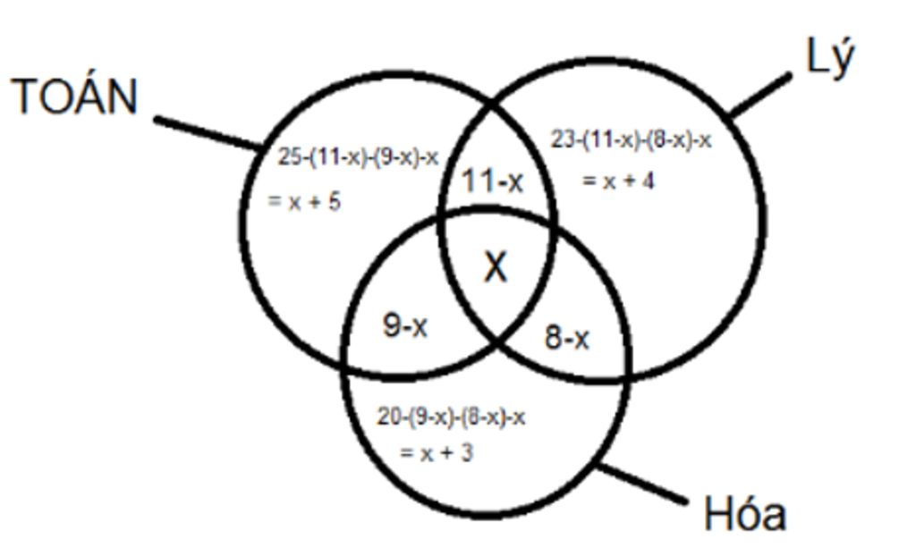 Lớp 10A có 45 học sinh trong đó có 25 em học giỏi môn Toán, 23 em học giỏi môn Lý, 20 em học giỏi môn Hóa, 11 em học giỏi cả môn Toán và môn Lý, 8 em học giỏi cả môn Lý và môn Hóa, 9 em học giỏi cả môn Toán và môn Hóa. Hỏi lớp 10A có bao nhiêu bạn học giỏi cả ba môn Toán, Lý, Hóa, biết rằng mỗi học sinh trong lớp học giỏi ít nhất một trong 3 môn Toán, Lý, Hóa? chỉ chi tiết với nhớ là chi tiết