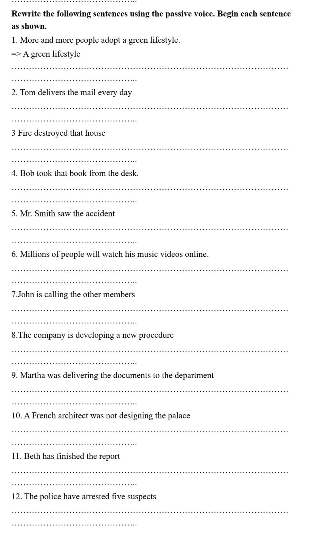 Rewrite the following sentences using the passive voice. Begin each sentence as shown.