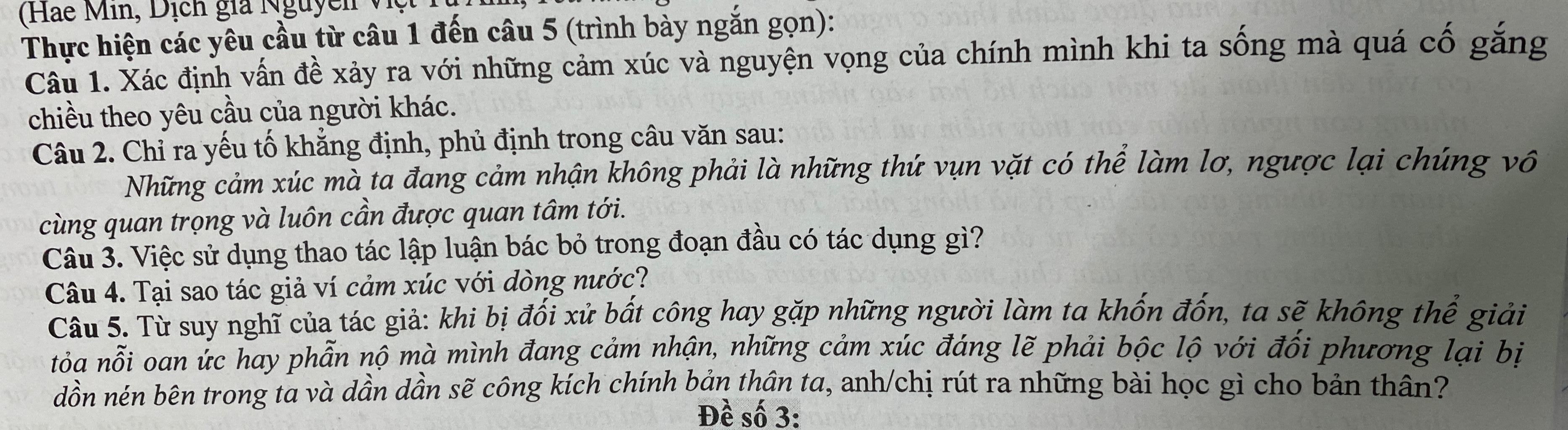 Đọc văn bản sau:Nhưng vấn đề là, khi ta sống mà quá cố gắng chiều theo yêu cầu của người khác, ta sẽ bỏ bê những cảm xúc và nguyện vọng của chính mình. Nếu không xem trọng mà lơ đi những gì mình đang cảm nhận thì khi trưởng thành ta sẽ không biêt mình muôn làm gì, bản thân minh là a1. Hơn nữa khi bị đôi xử bất công hay gặp những người làm ta khốn đốn, ta sẽ không thể giải tỏa nỗi oan ức hay phẫn nộ mà mình đang cảm nhận, những cảm xúc đáng lẽ phải bộc lộ với đối phương lại bị dồn nén bên trong ta và dần dần sẽ công kích chính bản thân tạ.