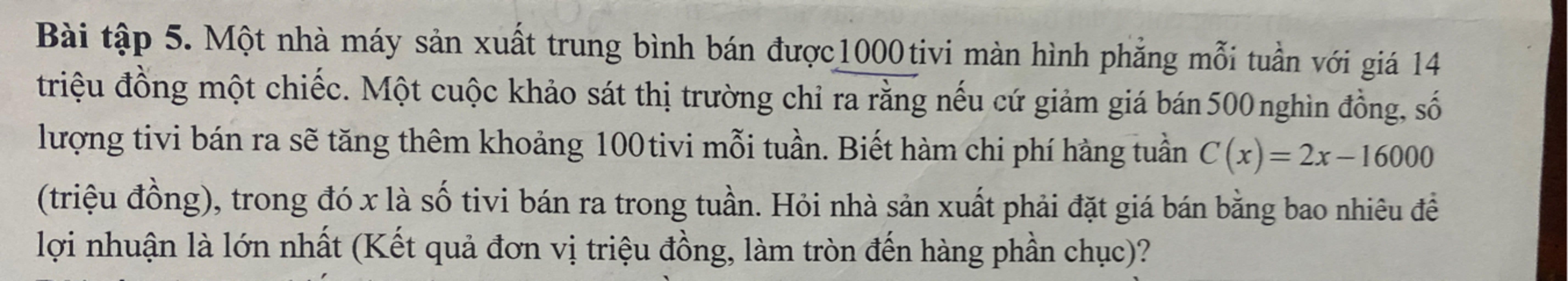 Bài tập 5. Một nhà máy sản xuất trung bình bán được 1000 tivi màn hình phẳng mỗi tuần với giá 14