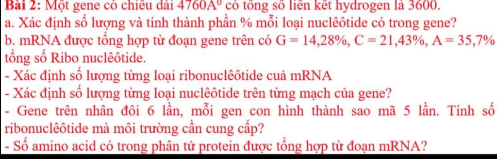 rNcungcp=1400×320=448000r cap N sub c u n g c p end-sub equals 1400 cross 320 equals 448000𝑟𝑁𝑐𝑢𝑛𝑔𝑐𝑝=1400×320=448000 ribonucleotide. Số amino acid có trong phân tử protein