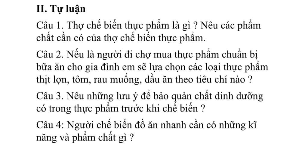 Câu 1: Thợ chế biến thực phẩm là người thực hiện công việc chế biến các loại thực phẩm để phục vụ cho việc ăn uống, bao gồm việc chế biến, nấu nướng, và trang trí món ăn sao cho hợp lý và hấp dẫn. Họ có thể làm việc trong các nhà hàng, khách sạn, bếp ăn tập thể hoặc các cơ sở chế biến thực phẩm.