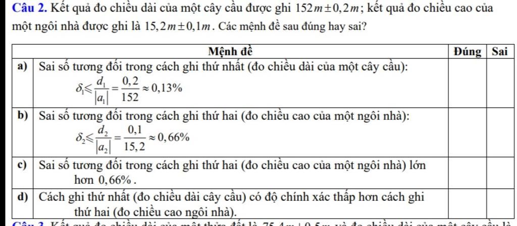 Câu 2. Kết quả đo chiều dài của một cây cầu được ghi 152m±0,2m; kết quả đo chiều cao của