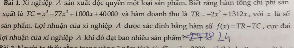 sản phẩm. Lợi nhuận của xí nghiệp A được xác định bằng hàm số f(x)=TR-TC, cực đại