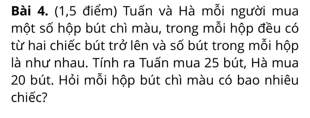 Gọi số bút chì màu trong mỗi hộp mỗi bạn mua là x (x thuộc N*| 2<x)