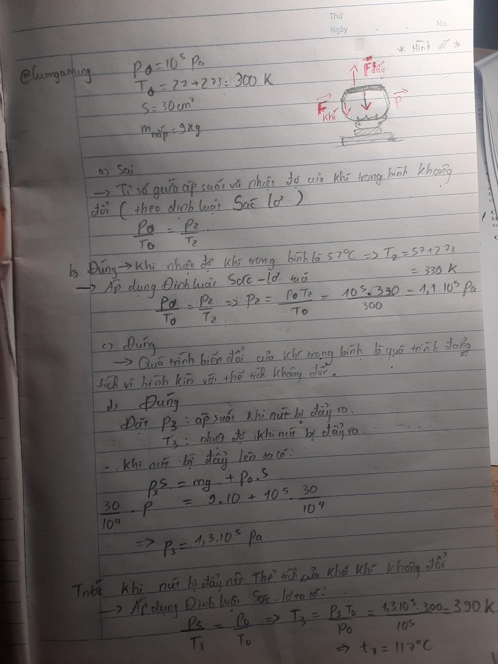 b) Đúng. Áp dụng định lý khí lý tưởng: P2=1.1×10^5 Pa.