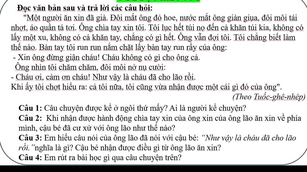 - Cậu bé đã lục trong túi để xem có gì cho ông lão không. Cậu rất muốn giúp đỡ ông nhưng trong túi chẳng có gì hết, bàn tay của cậu run run nắm chặt lấy tay của ông lão.