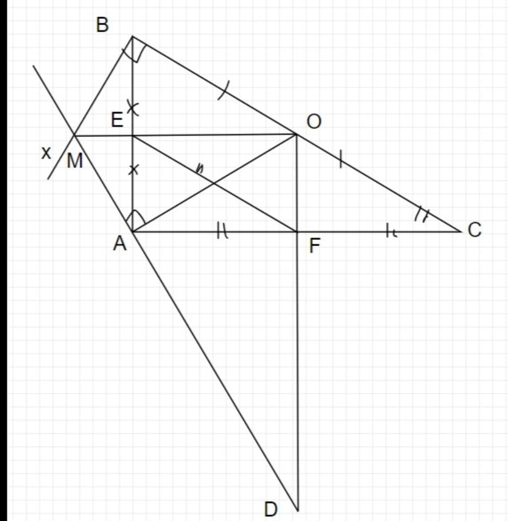 1) Cho tam giác ABC vuông tại A. O là trung điểm của BC. Vẽ tia Bx vuông góc với BC (Bx cùng phía với điểm A đối với đường thăng BC). Qua A vẽ đường thẳng vuông góc với AO cắt Bx ẻ M. Đường thăng qua ( va song song với AB cắt AM ở D, AC c F. Dường thẳng MO cắt AB ở E. a) Chứng minh rằng: EF = AO. b) BD cắt CM ở I Chứng minh rằng: Ba điểm E. I, F thẳng hàng.(vẽ hình giúp)