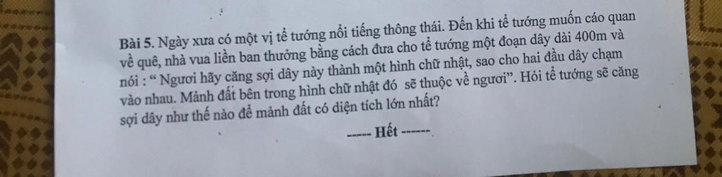 $\to$Tể tướng căng mảnh đất thành hình vuông có cạnh là $100m$