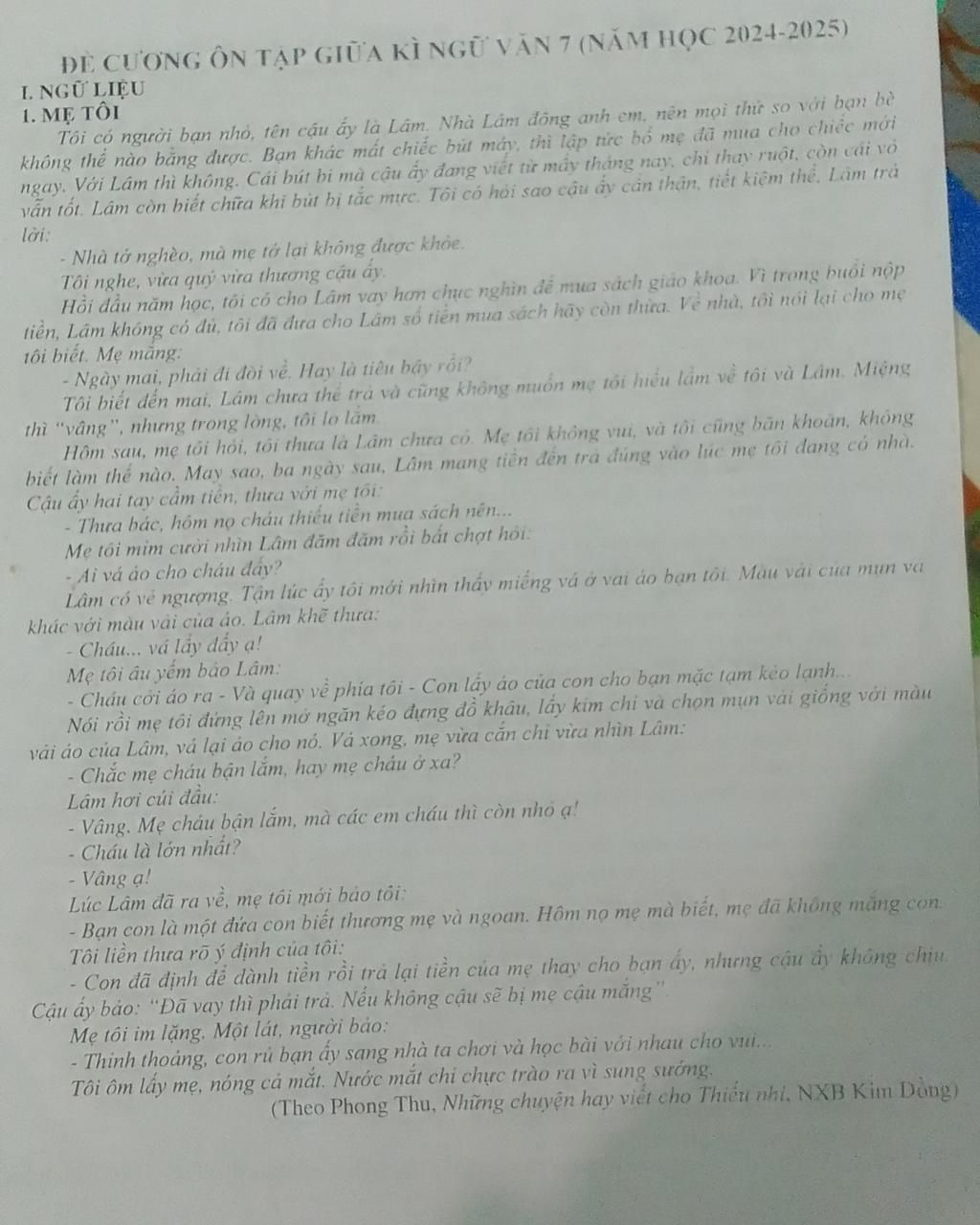 Truyện ngắn “Mẹ tôi” của Phong Thu kể lại một câu chuyện nhỏ nhưng thấm đẫm tình người, thông qua lời kể của người con về mẹ mình và người bạn tên Lâm. Lâm là một cậu bé ngoan, sống trong một gia đình nghèo, đông anh em và có mẹ đau yếu. Vì hoàn cảnh khó khăn, cậu phải chắt chiu từng món đồ nhỏ, tự vá áo, và khi đi học còn phải vay bạn ít tiền để mua sách. Chính từ việc người con cho bạn vay tiền và bị mẹ mắng đã mở ra tình huống truyện, để người mẹ – một người phụ nữ tưởng như nghiêm khắc – bộc lộ rõ phẩm chất nhân hậu, tinh tế và giàu yêu thương. Qua đó, tác giả thể hiện thông điệp về giá trị của tình thương, sự cảm thông và cách giáo dục bằng trái tim.