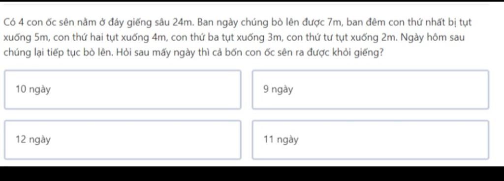 Số ngày ốc sên thứ bốn đủ để bò thoát ra ngoài là `:`