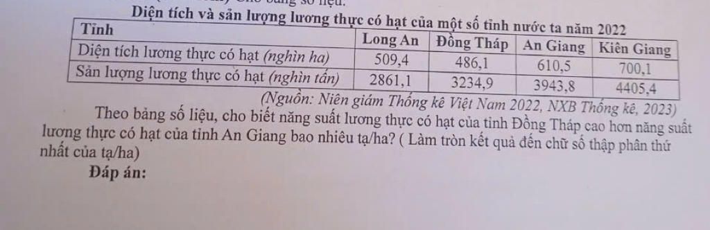 `-` Năng suất của tỉnh Đồng Tháp cao hơn năng suất của tỉnh An Giang là: