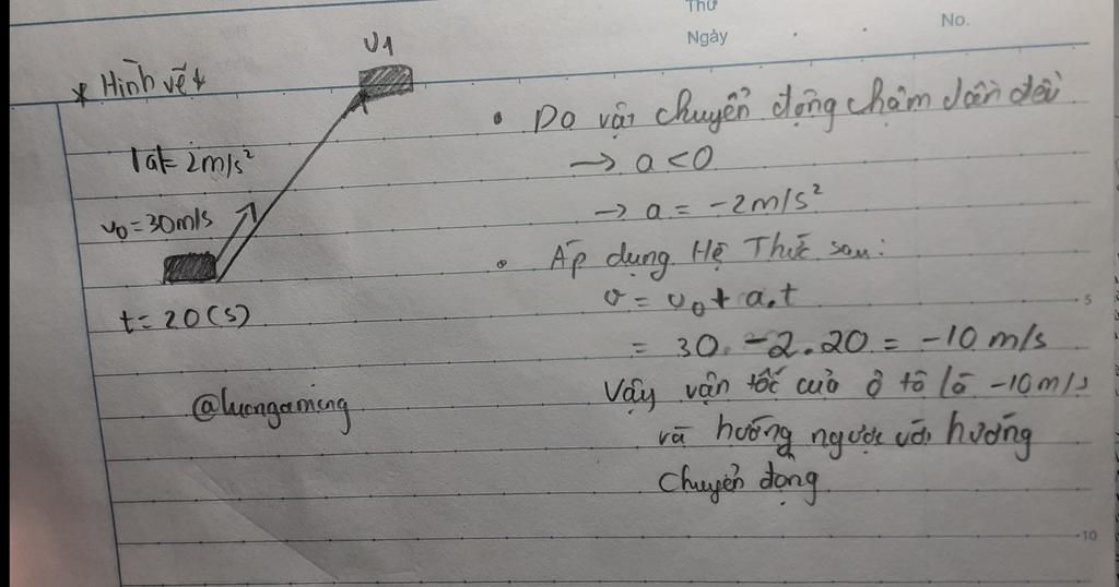 1 ô tô đang chuyển động với vận tốc = 30 m/s đến chân 1 con dốc thì đột nhiên tắt máy, ô tô chuyển động chậm dần đều ,với a = 2m/$s^{-2}$ trong suốt quá trình lên dốc và xuống dốc .tính vận tốc của ô tô khi leo dốc 20s khi đó ô tô chuyển động hướng nào