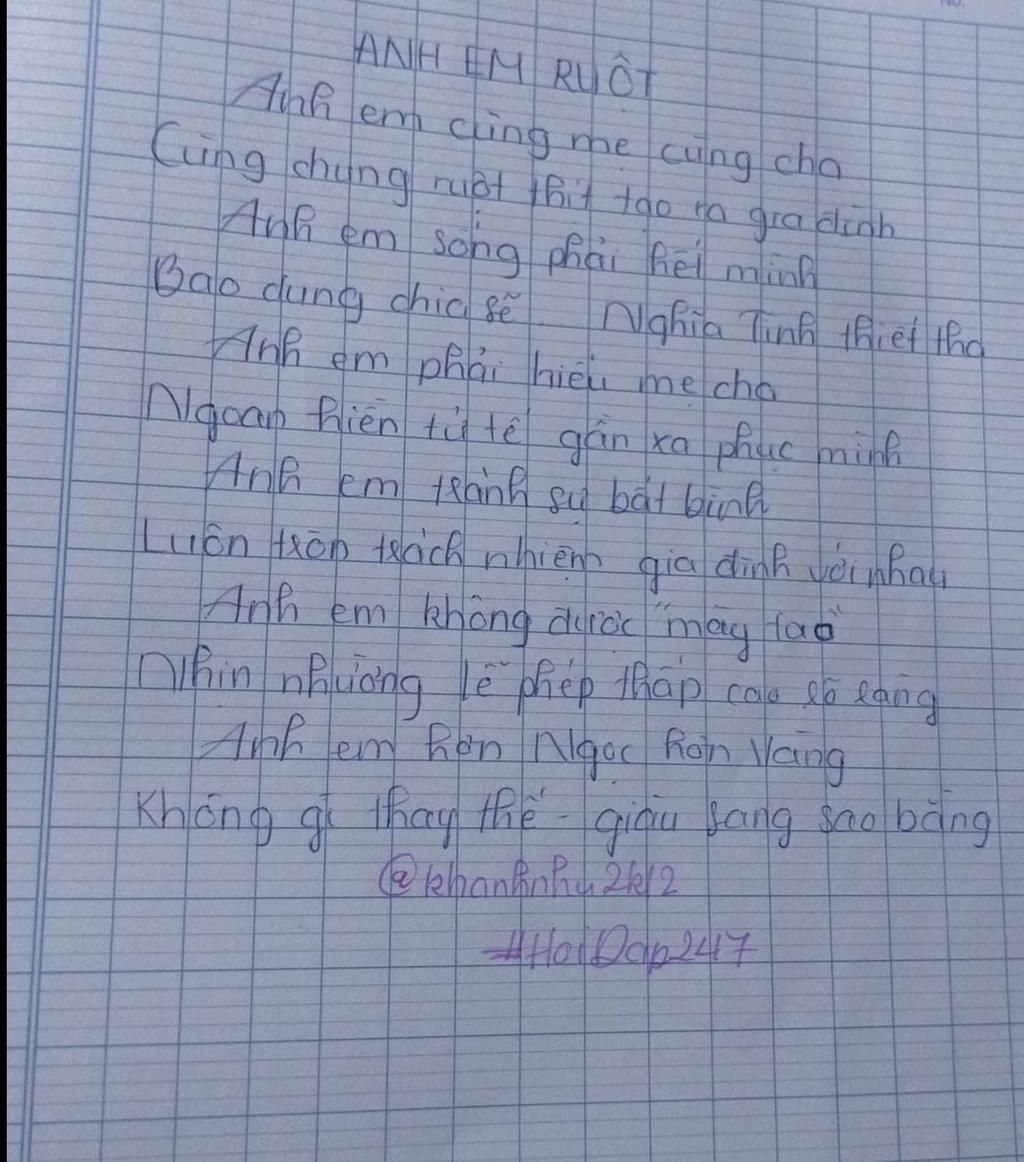 Bài thơ đó đã gợi lên trong em bao nhiêu cảm xúc khó tả. Những câu thơ giản dị, mộc mạc như chính tình cảm anh em vậy. Em xúc động trước tình cảm gắn bó, thân thương, đùm bọc lẫn nhau của những người trong gia đình. Hình ảnh anh em cùng nhau lớn lên, cùng nhau chia sẻ vui buồn, cùng nhau vượt qua khó khăn đã khiến em nhớ về tuổi thơ của mình, nhớ về những kỉ niệm đẹp đẽ bên cạnh anh chị em. Bài thơ không chỉ là những vần thơ, mà còn là một bức tranh sống động về tình anh em ruột thịt, thiêng liêng và đáng quý. Đọc xong bài thơ, em càng thêm trân trọng tình cảm gia đình và biết ơn những người thân yêu của mình.