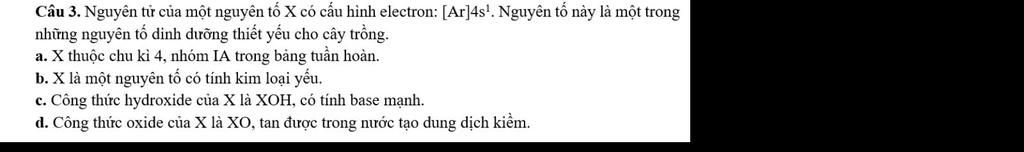 \begin{array}{|c|c|c|}\hline \text{Đúng}&\text{X thuộc chu kì 4, nhóm IA trong bảng tuần hoàn} \\\hline \text{Sai}&\text{X là một nguyên tố có tính kim loại yếu} \\\hline \text{Đúng}&\text{Công thức hydroxide của X là XOH, có tính base mạnh} \\\hline \text{Sai}&\text{Công thức oxide của X là XO, tan được trong nước tạo dung dịch kiềm} \\\hline\end{array}