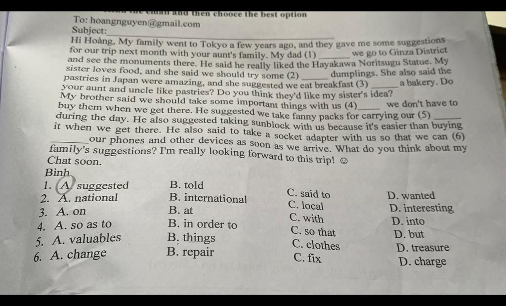 S + suggested +(that) + S+ (should) + V1 : đề nghị
