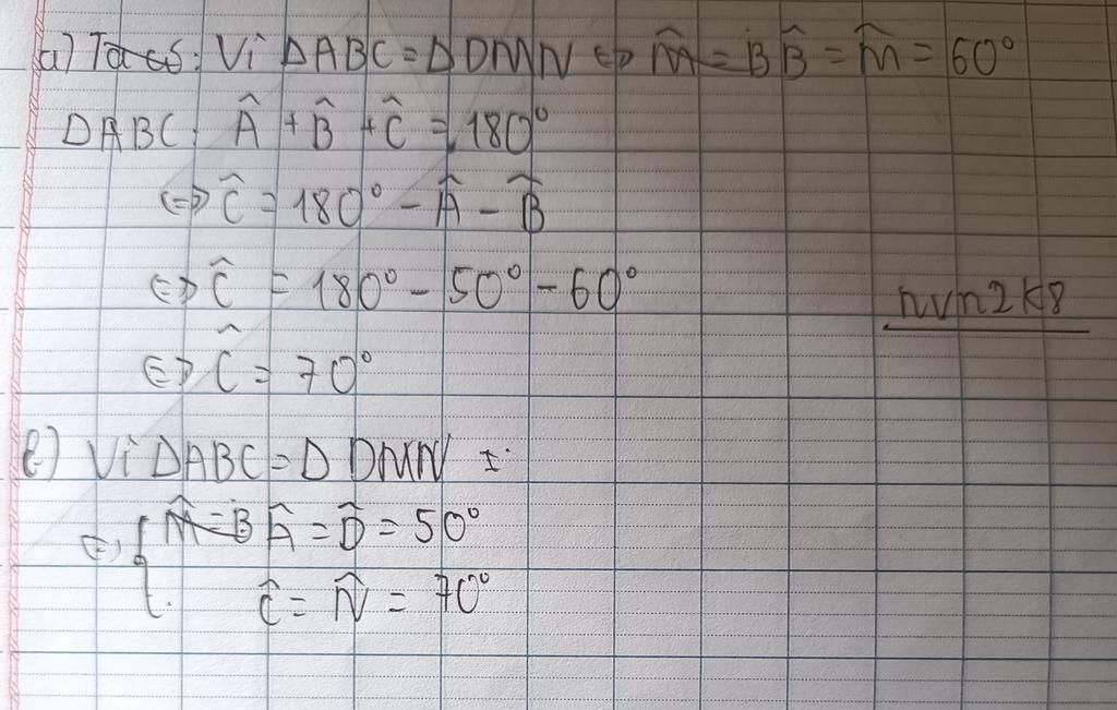 cho tam giác abc = tam giac DMN. biết A = 50 độ M= 60 độ.