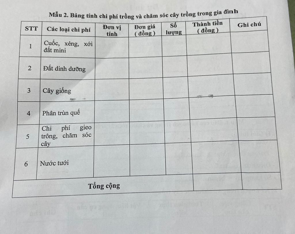 Mẫu 2. Bảng tính chi phí trồng và chăm sóc cây trồng trong gia đình