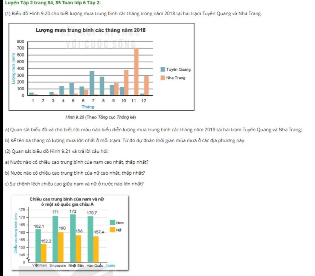 | (1) Biểu đồ Hình 9.20 cho biết lượng mưa trung bình các tháng trong năm 2018 tại hai trạm Tuyên Quang và Nha Trang.